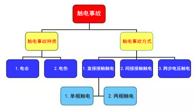 人體不同部位接觸不同電位則有電流流過為觸電。分為“電擊”與“電傷”兩類。