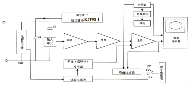 試品Ca在試驗電壓下產(chǎn)生局部放電時,放電脈沖信號經(jīng)藕合電容Ca送入輸入單元,由輸入單元拾取到脈沖信號,經(jīng)低噪聲前置放大器放大,濾波放大器選擇所需頻帶及主放大器放大(達到所需幅值與產(chǎn)生零標志脈沖)后,在示波屏的橢圓掃描基線上產(chǎn)生可見的放電脈沖,同時也送至脈沖峰值表顯示其峰值。