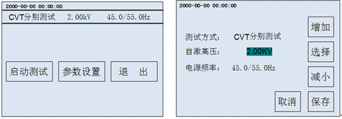 首先根據(jù)相應的接線提示接好儀器外部的連線,然后點擊主界面“CVT測試”選項,進入下一級CVT測試菜單(如圖5-5)。然后可以點擊“參數(shù)設置”進去設置菜單(如圖5-5)進行詳細的測試參數(shù)設置。分別點擊每個需要設置的項目,按“增加”“減小”或“選擇”來修改。修改完成后點擊“保存”即可保存剛才所修改的參數(shù)并返回CVT測試界面,點擊“取消”則不保存本次修改并返回CVT測試界面。