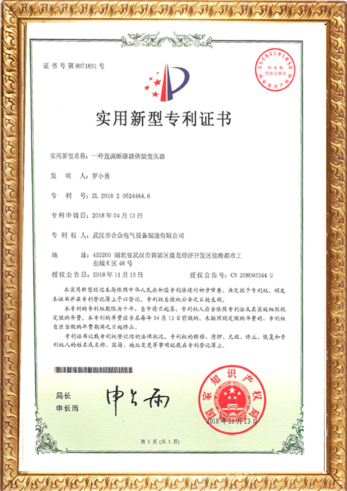 直流斷路器功能變壓器專利證書