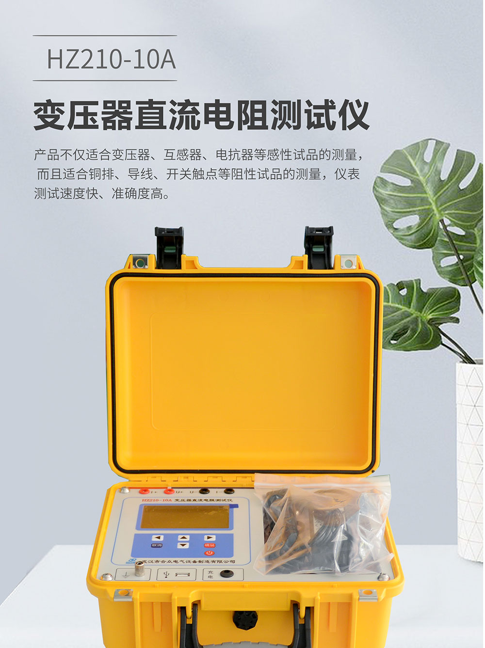 直流電阻測(cè)試儀 HZ210-10A 變壓器直流電阻測(cè)試儀是一款創(chuàng)新型產(chǎn)品,內(nèi)置大容量鋰電池,儀器與測(cè)試線采用機(jī)線一體設(shè)計(jì),產(chǎn)品體積小巧,便于攜帶。產(chǎn)品不僅適合變壓器、互感器、電抗器等感性試品的測(cè)量,而且適合銅排、導(dǎo)線、開(kāi)關(guān)觸點(diǎn)等阻性試品的測(cè)量,儀表測(cè)試速度快、準(zhǔn)確度高。