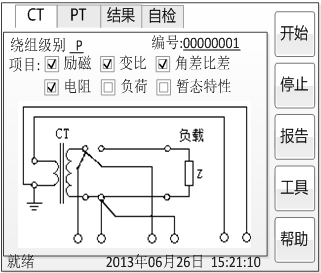 合眾電氣智能互感器測試儀用旋轉(zhuǎn)鼠標(biāo)切換光標(biāo),選擇要進(jìn)行的試驗(yàn)項(xiàng)目,當(dāng)光標(biāo)停留在某個(gè)試驗(yàn)項(xiàng)目時(shí),屏幕顯示與該試驗(yàn)項(xiàng)目相關(guān)的參數(shù)設(shè)置;當(dāng)光標(biāo)離開試驗(yàn)項(xiàng)目時(shí),屏幕顯示所選試驗(yàn)項(xiàng)目所對應(yīng)的接線圖。